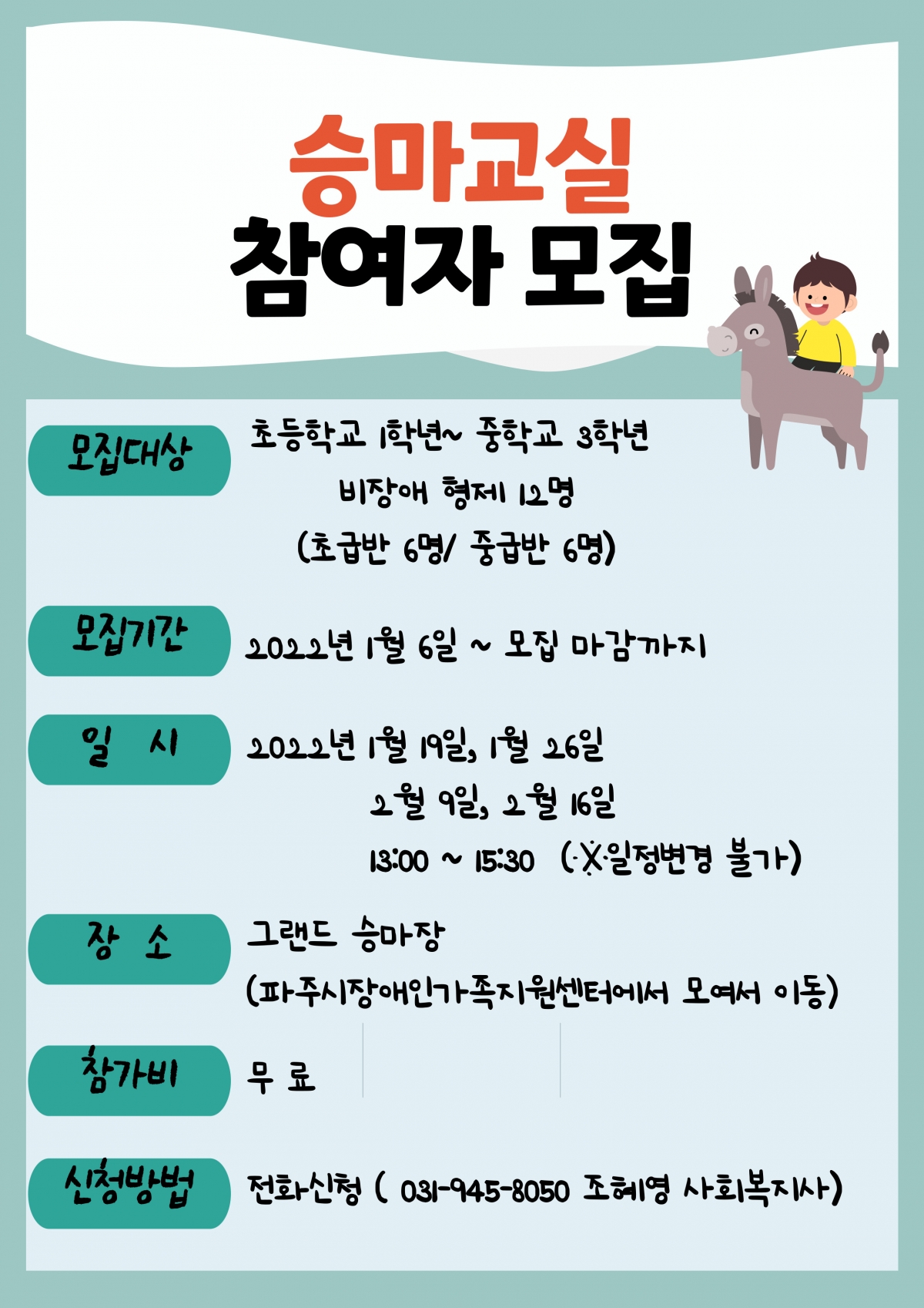 파주시장애인가족지원센터에서 2022년 비장애형제 승마교실 참여자를 모집합니다.