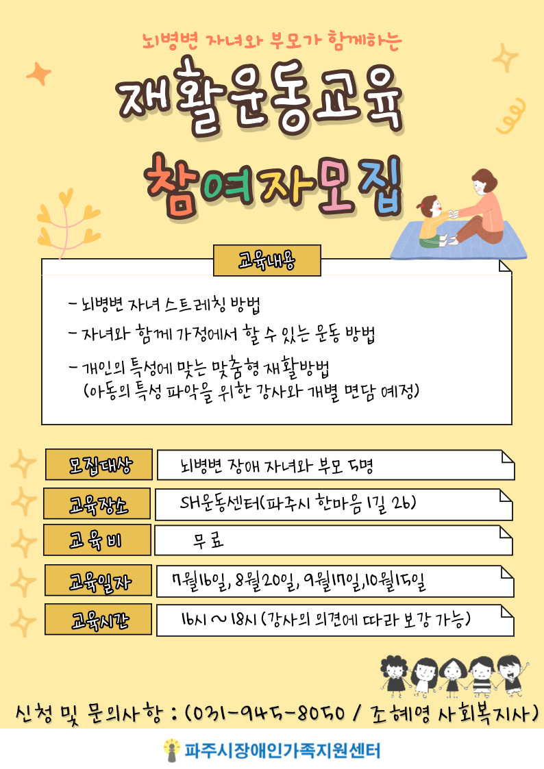 2022년 파주시장애인가족지원센터 자녀와 함께하는 뇌병변 재활운동교육 프로그램 참여자 모집
