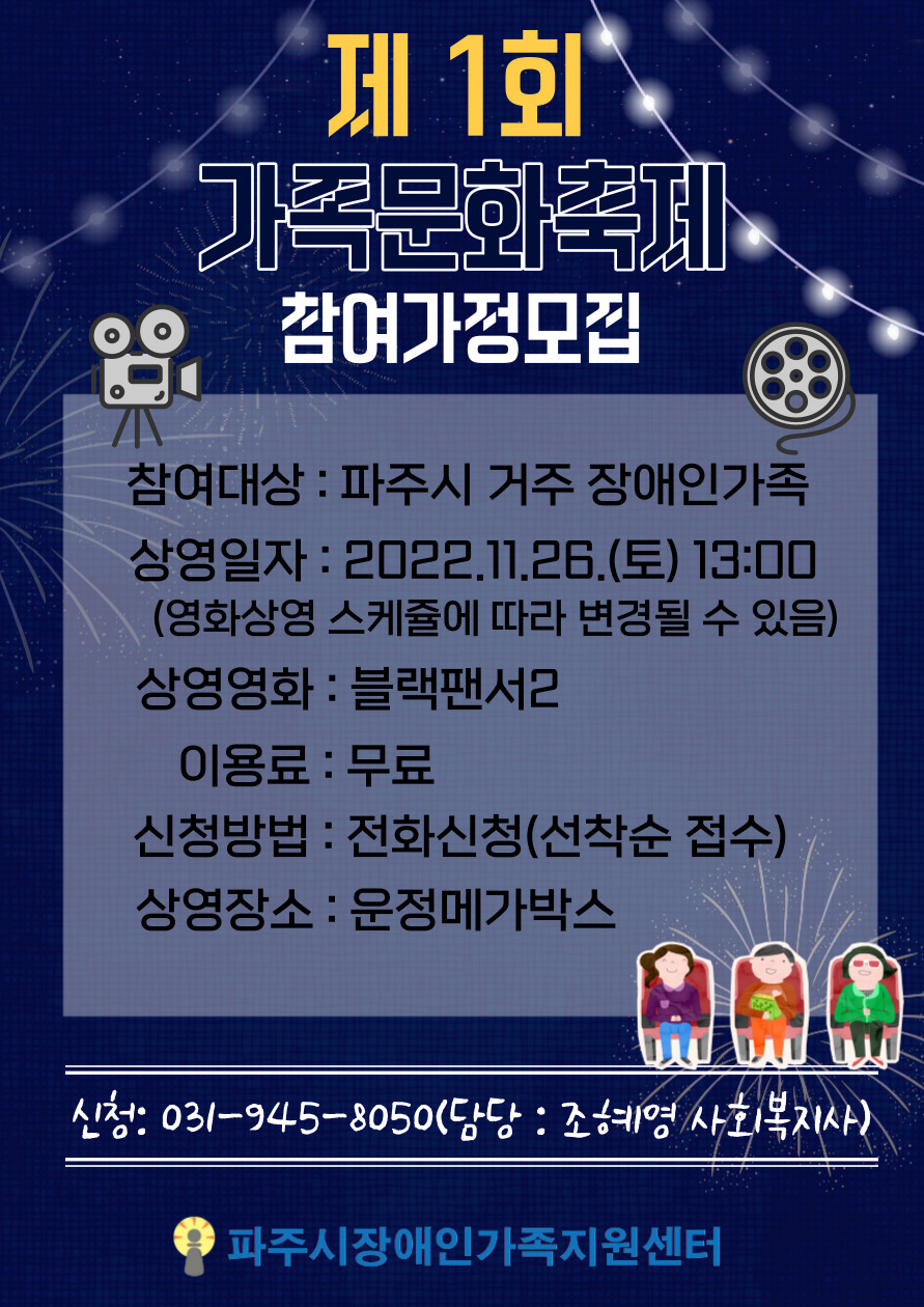 파주시장애인가족지원센터에서 2022년 제 1회 가족문화축제 참여가정을 모집합니다.