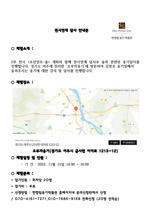 -신청방법: 한향림옹기박물관 홈페이지 내 문의신청란 신청 / 전화신청 : 070-4161-7271, 010-7685-9158(선착순 접수)
