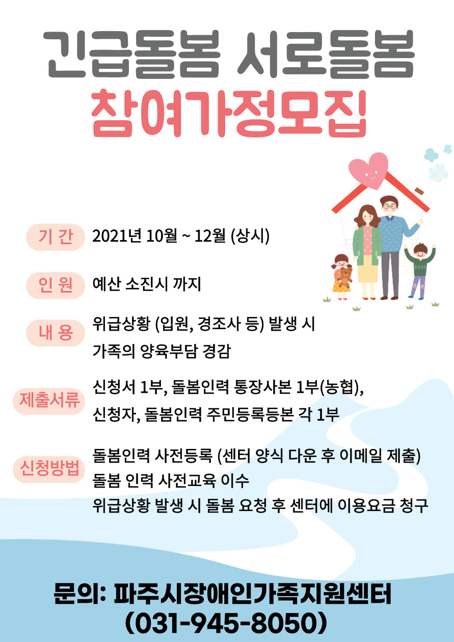 파주시장애인가족지원센터에서 긴급돌봄·서로돌봄 참여 가정을 모집합니다.