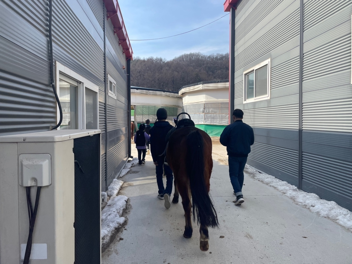 말과 정서적인 교감을 한 후 마방에서 말을 배정받은 후 원형마장으로 이동하였습니다.