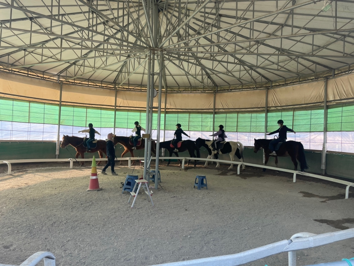 원형마장에 도착하여 말에 탑승 한 후 왼팔돌리기, 오른팔 돌리기, 양팔 벌리기 등 중심잡는 연습을 하였습니다.