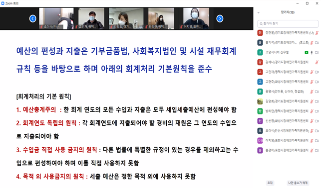 파주시장애인가족지원센터(이하 센터)는 3월 28일(월) 오후 2시부터 3시간동안 실무자 역량강화 교육의 일환으로 '사회복지 재무회계 규칙'에 대해 온라인 교육을 진행했습니다.