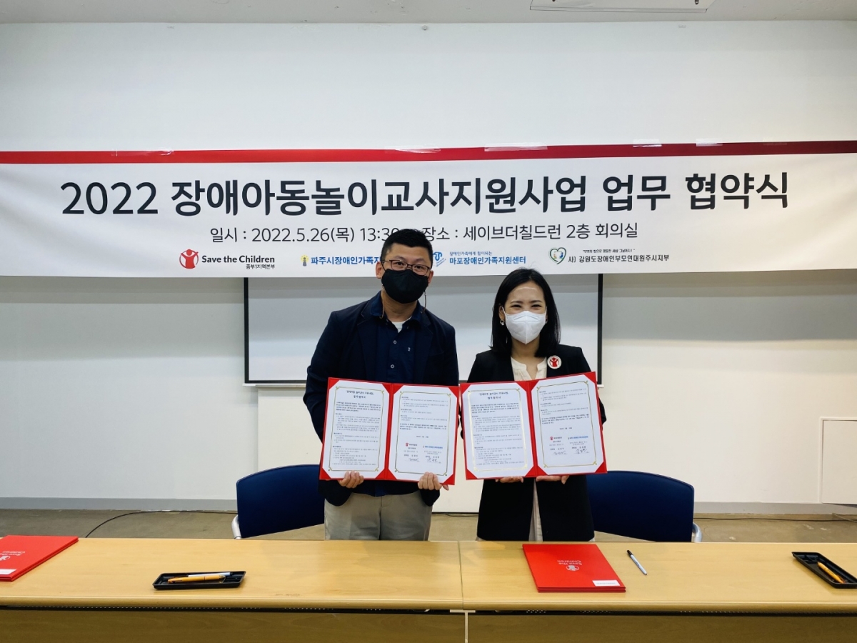 파주시장애인가족지원센터는 세이브더칠드런과 함께 ‘장애아동 놀이교사 지원사업’을 위한 업무협약을 26일 체결했습니다.