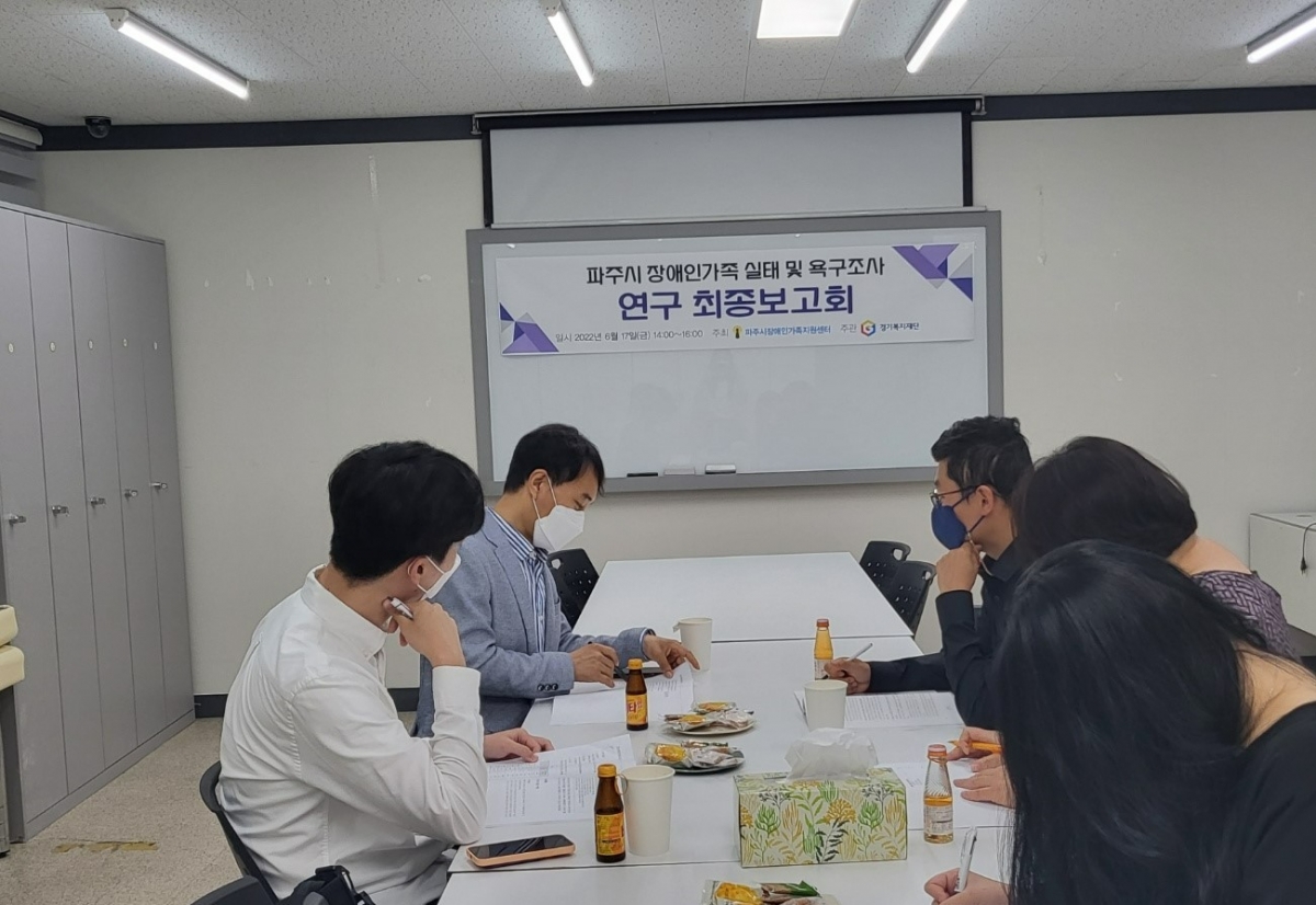 의뢰한 연구에 대한 '파주시 장애인가족 실태 및 욕구조사 연구 최종보고회'가 6월 17일 10시 30분에 진행되었습니다.