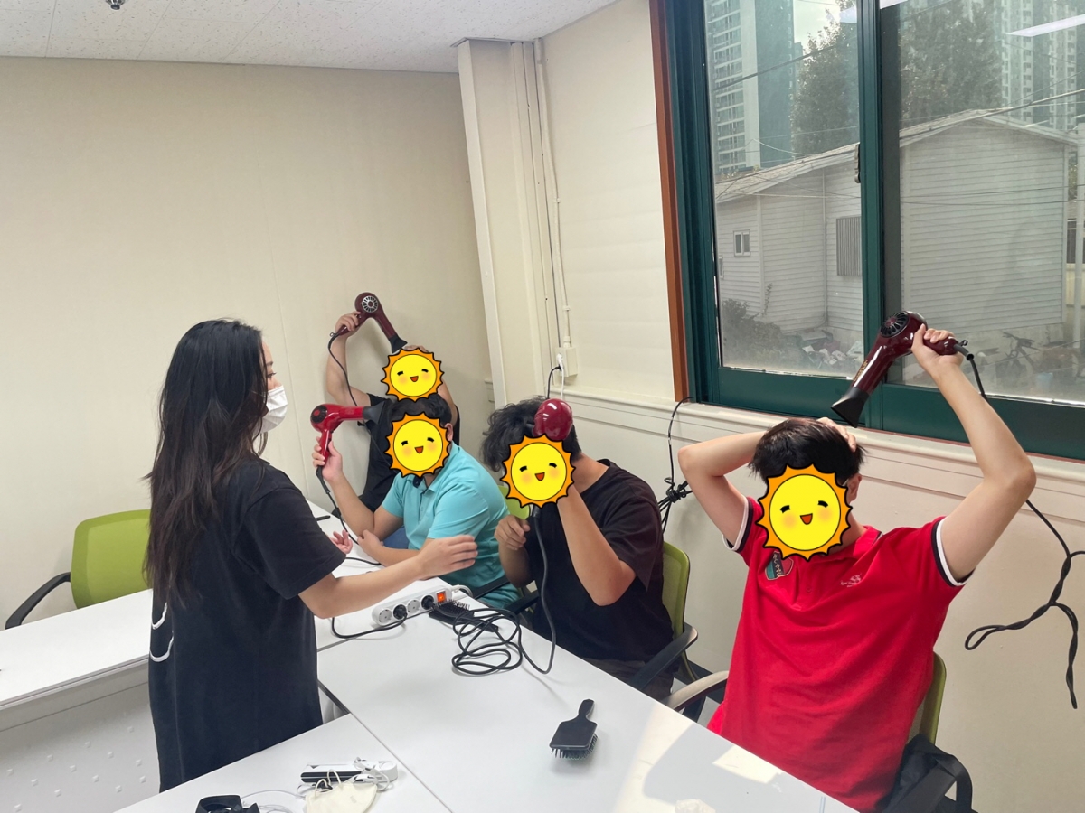 그 후 헤어 드라이 방법에 대한 교육이 진행되었습니다.