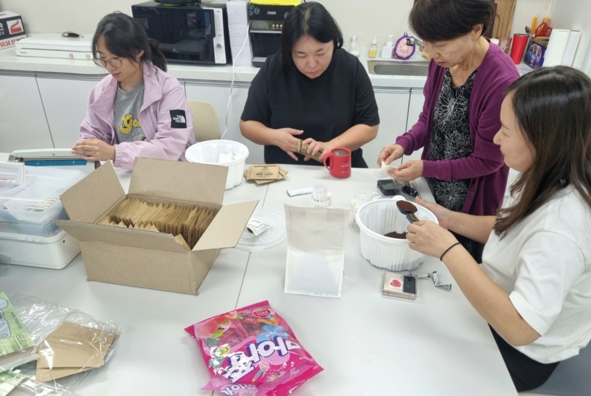 먹거리(과자들, 쫀디기, 직원들이 직접 수작업으로 만든 커피 드립백, 믹스커피 등),