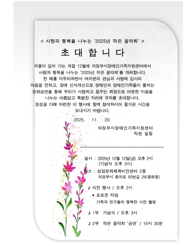 [홍보] 의정부장애인가족지원센터 "2025 사랑과 행복을 전하는 작은 음악회"